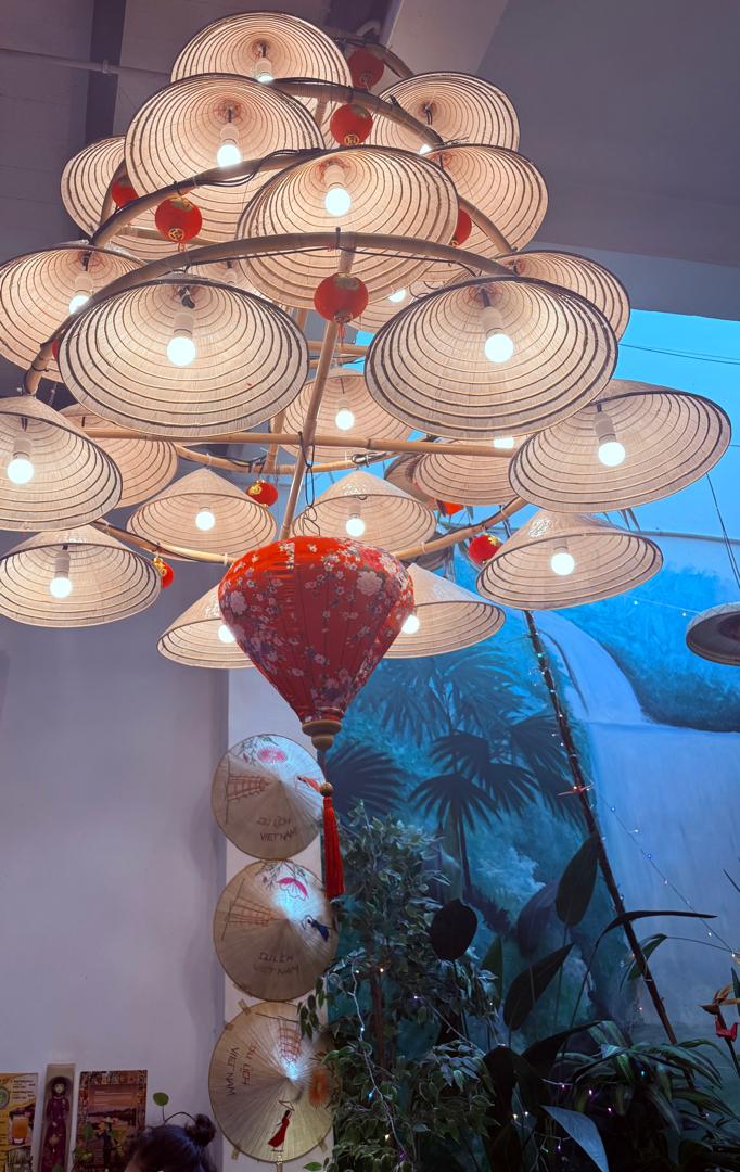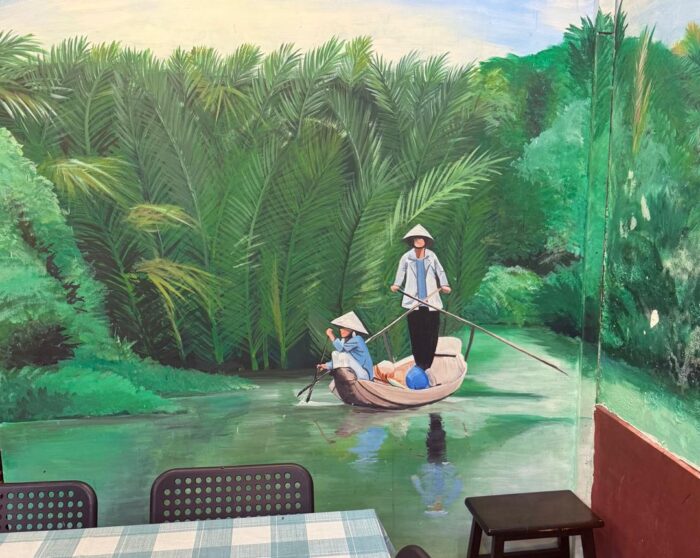 It was a blessed assignment. Allah had to be with us. Proof? We  found a parking spot in front of the restaurant. We arrived and were escorted to a reserved table. As you shall see the decor was elegant, refined, reflecting the culture and beauty of Viet Nam. The owner of the restaurant and his lovely wife regaled us with stories of their life, and  the history of the restaurant.  The owner Michael Tan painted the beautiful wall murals when the restaurant first opened. I pictured one of them in my Good Morning greeting of the day.