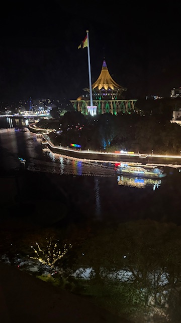 Later in the afternoon, Theresa came by and we went over some last minute details. Then back to the Executive Lounge where cocktails and an ample repast was being severed. Dramatic festivities – light shoes, boats going up and down the Sawarak River. Very exciting. A young man came to my table asking if he could join me. Utterly darling. I have a new boyfriend who lives in Brunei. I interviewed him – darling. He is young – 5. I could be his great grandmother. Well I am great. Hahaha More about all of that later.